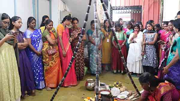கோவை மாவட்டம் இராமநாதபுரம் பகுதியில், சில்க் வில்லேஜ் கைத்தறி ஆராய்ச்சி மையத்தில் நடைபெற்ற பொங்கல் விழா.. கல்லூரி மாணவ மாணவியர்கள் பொங்கல் வைத்து சிறப்பு வழிபாடு நடத்தினர்.