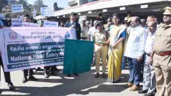நீலகிரி மாவட்டம், உதகை மத்திய பேருந்து நிலையத்தில், வட்டார போக்குவரத்துத்துறையின் சார்பில், தேசிய சாலை பாதுகாப்பு மாதத்தை முன்னிட்டு  நடைபெற்ற விழிப்புணர்வு பேரணியினை, மாவட்ட ஆட்சித்தலைவர்  லட்சுமி பவ்யா தண்ணீரு அவர்கள் கொடியசைத்து துவக்கி வைத்து, சாலை பாதுகாப்பு குறித்தான துண்டு பிரசுரங்களை வழங்கி விழிப்புணர்வு ஏற்படுத்தினார்.