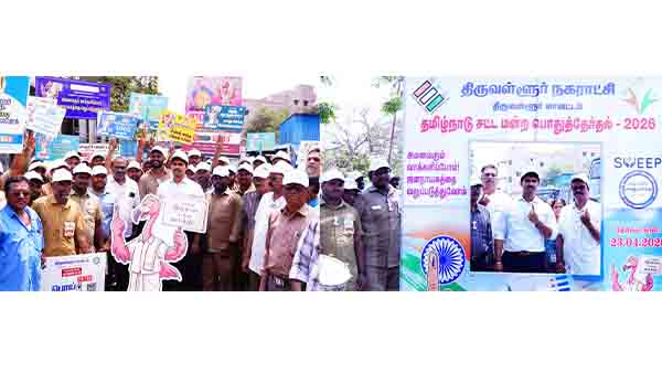 திருவள்ளூர் மார்ச் 27 : திருவள்ளூர் சட்டமன்ற தொகுதிக்கு உட்பட்ட பழைய திரு.வி.க பேருந்து நிலையத்தில் “தேர்தல் திருவிழா-தமிழ்நாட்டின் பெருவிழா” சட்டமன்ற பொது தேர்தல் 2026 யை முன்னிட்டு 100 சதவிகித வாக்குப்பதிவை வலியுறுத்தி பல்வேறு விழிப்புணர்வு நிகழ்ச்சிகள் மாவட்ட தேர்தல் அலுவலரும் மாவட்ட ஆட்சியருமான மு.பிரதாப் தலைமையில் நடைபெற்றது.